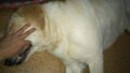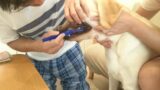 犬生初! の、「歯ブラシ」を体験しているのはレアル君。