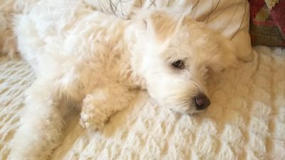 ニッコリ笑顔のしろ君。ビションフリーゼとチワワのMixで1歳児。