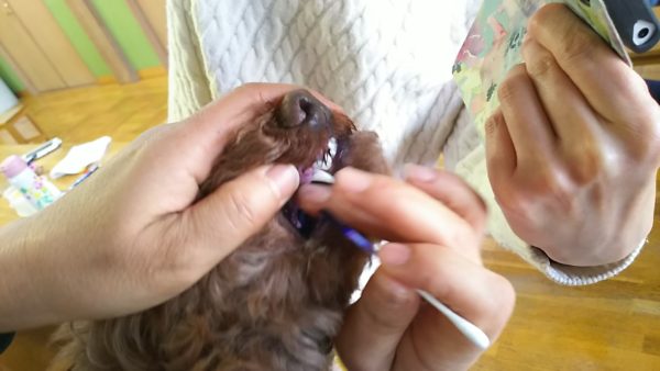 朝晩のゴハン後に愛犬の歯みがきをしている飼い主さんの犬は、染め出し液を塗布しても歯にも歯肉にも着色がありませんでした。