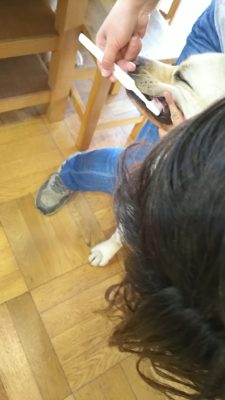 この子は、犬生初の歯ブラシ体験でした。乳歯が抜けはじめてきたので、今のうちに歯みがき練習して永久歯になったら本番モードで歯みがきできるように、まずは歯ブラシを噛まない練習からスタート。